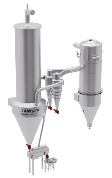 The chamber features a large cylindrical section that provides sufficient residence time for large particles to dry under gentle conditions. Most of the powder is discharged at the chamber bottom and can be further dried or cooled in an external fluid bed.